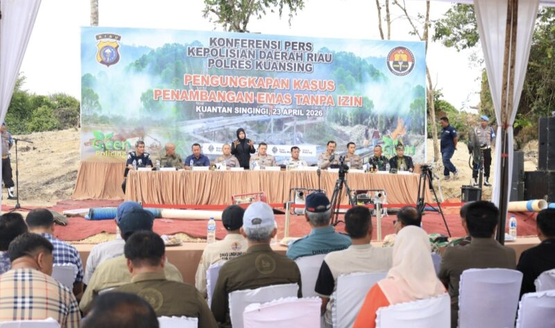 Wakapolda Riau Brigjen Hengki Haryadi memimpin langsung jumpa pers pengungkapan kasus Pertambangan Emas Tanpa Izin (PETI) di wilayah hukum Polres Kuantan Singingi, Kamis (23/4/2026).